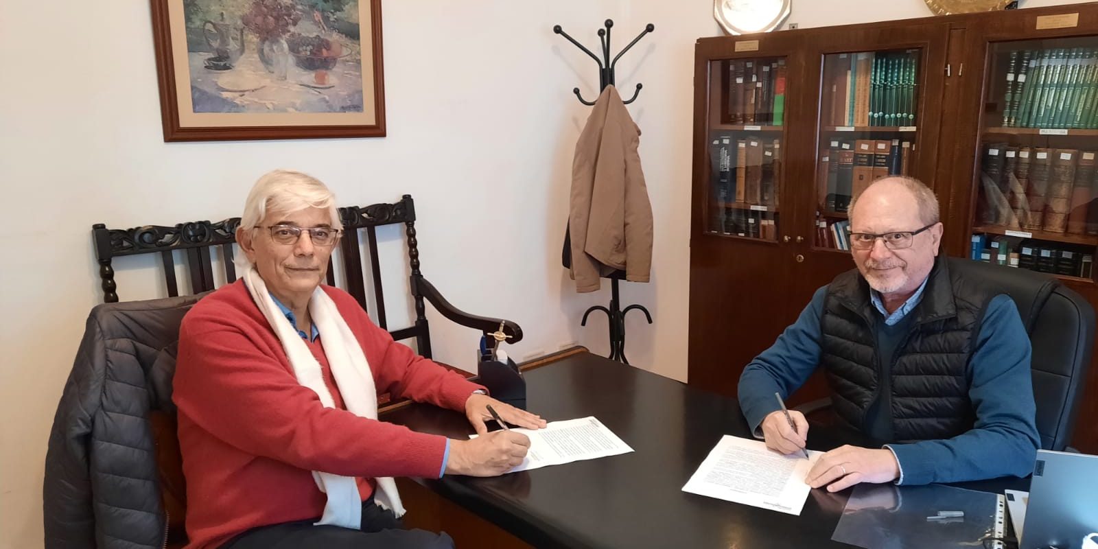Firma de convenio con la sociedad argentina de geriatría y gerontología en la foto está el presidente de la fundación emergencias y el presidente de la sociedad de geriatría y gerontología